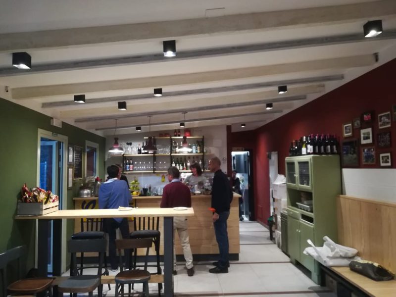 La sala è stata decorata con faretti a soffitto Wever & Ducrè per donare una luce omogenea e calda, con un tocco di industrial al bancone con Toscot Torino.