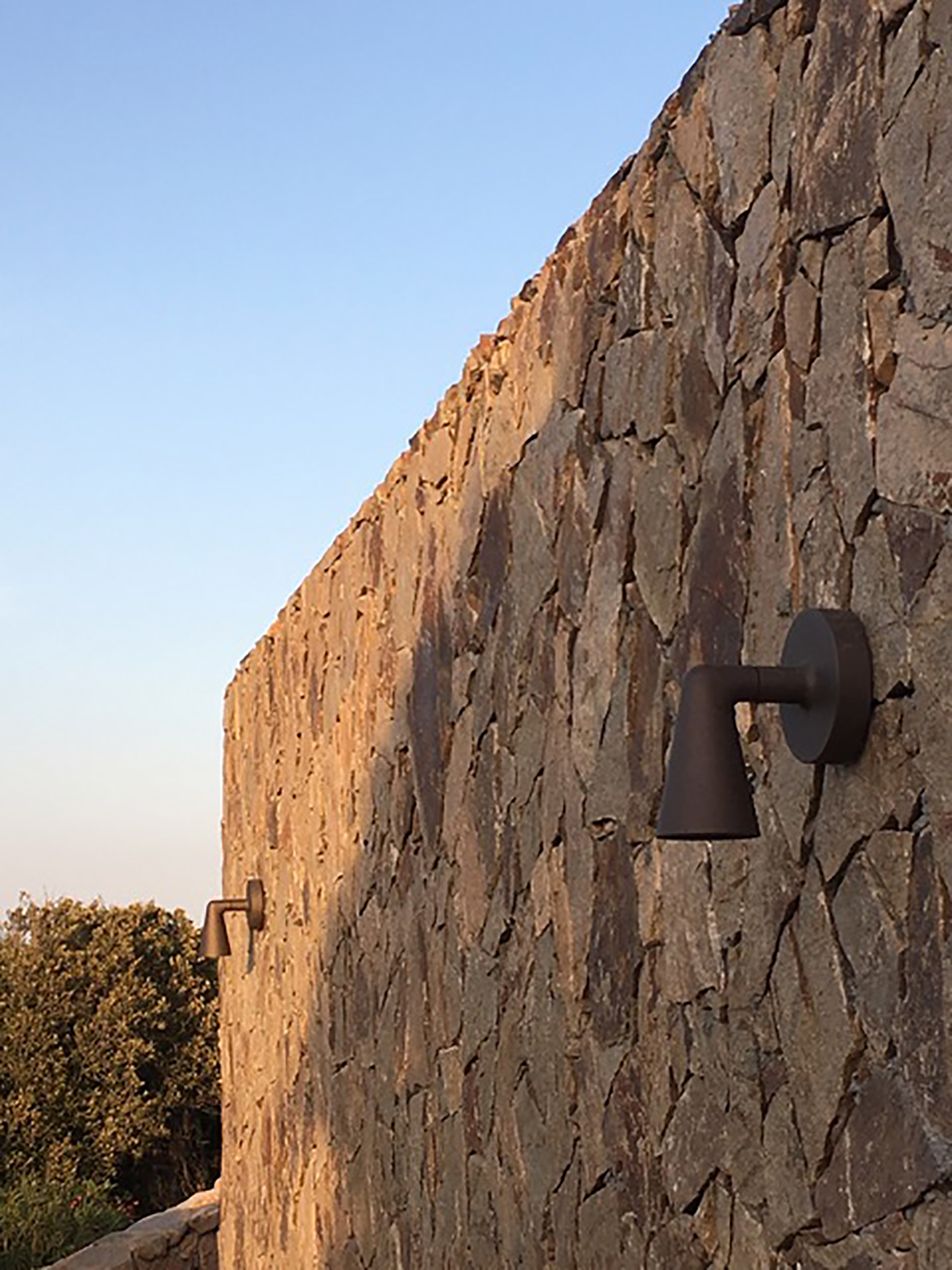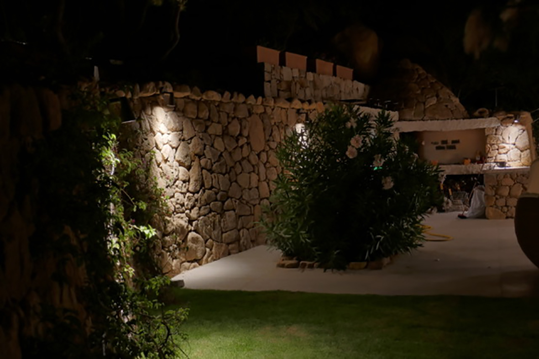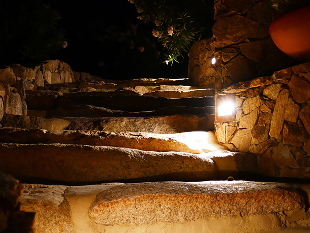 Con le luci esterne la sfida era di mettere in evidenza le sfumature di colore del granito sardo anche di notte, valorizzando il più possibile le strutture del giardino, dalla scala alle murature di contenimento, ma anche illuminare in modo funzionale le zone di conviviali e di lavoro.