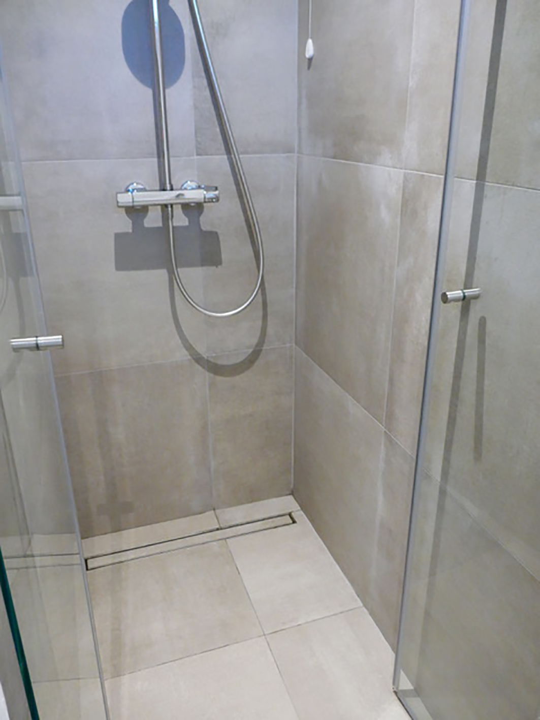 Nelle immagini troviamo i pavimenti e rivestimenti Prima Materia di Kronos 2, (anche in finitura antiscivolo per esterni), e le rubinetterie Fantini Rubinettiserie Mare.