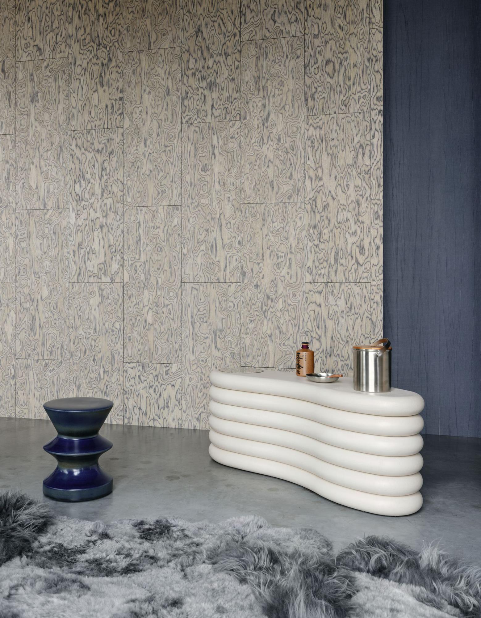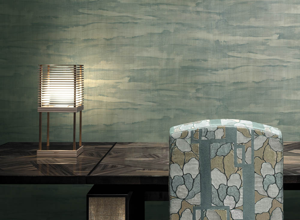 Una carta da parati di grande ispirazione è la “Bois coti” di Arte: un rivestimento murale per interni audaci e di grande impatto, realizzato in una splendida impiallacciatura di legno fiammato e intarsiato con motivo a blocchi.